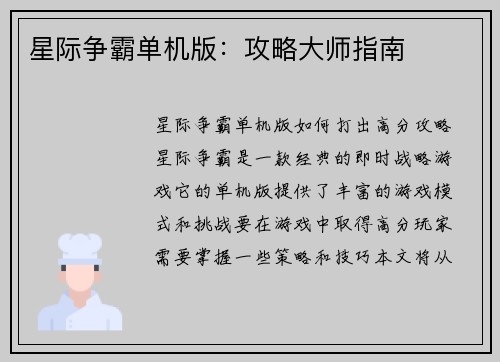 星际争霸单机版如何打出高分攻略 星际争霸是一款经典的即时战略游戏,它的单机版提供了丰富的游戏模式和挑战。要在游戏中取得高分,玩家需要掌握一些策略和技巧。本文将从多个方面介绍如何打出高分攻略。 1. 熟悉游戏规则和单位特性 在开始游戏之前,玩家需要熟悉游戏的基本规则和各个种族的单位特性。了解不同单位的优势和劣势,以及它们的技能和攻击方式,对于制定战略和应对对手是至关重要的。 2. 学会资源管理 资源...